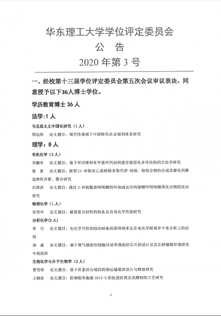 华东理工大学第十三届学位评定委员会第五次学位授予公告(2020年3号公告)