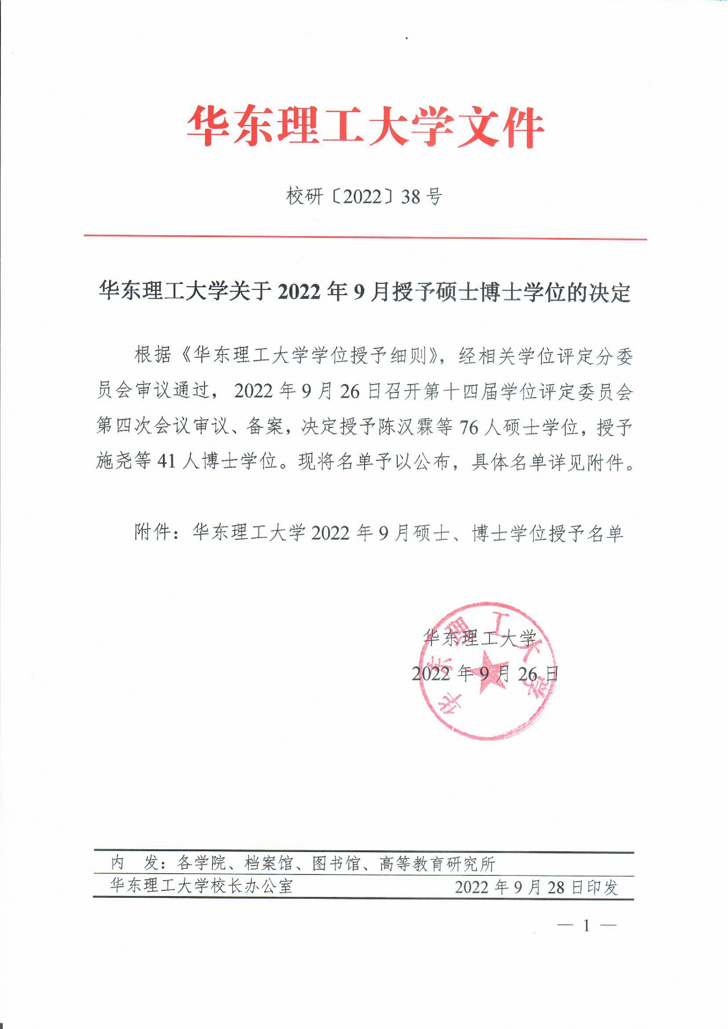 华东理工大学关于2022年9月授予硕士、博士学位的决定