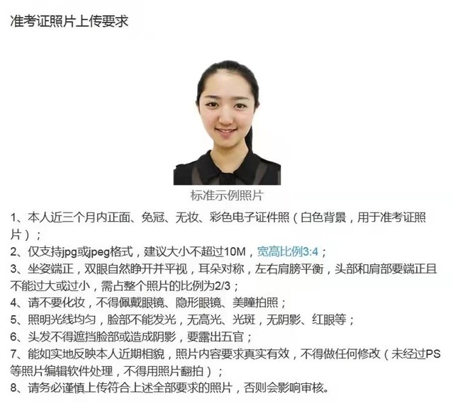 本人近三月内正面、免冠、无妆、彩色电子证件照。该照片将用于初试准考证、录取登记表、校园一卡通等,请务必按要求上传。照片要求见下图(白色背景):